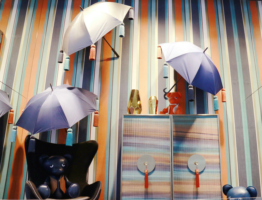 條紋壁紙與帶有流蘇的雨傘,眼神迷離的泰迪熊,這個(gè)場(chǎng)景展現(xiàn)的是一個(gè)有趣的“雨天”。